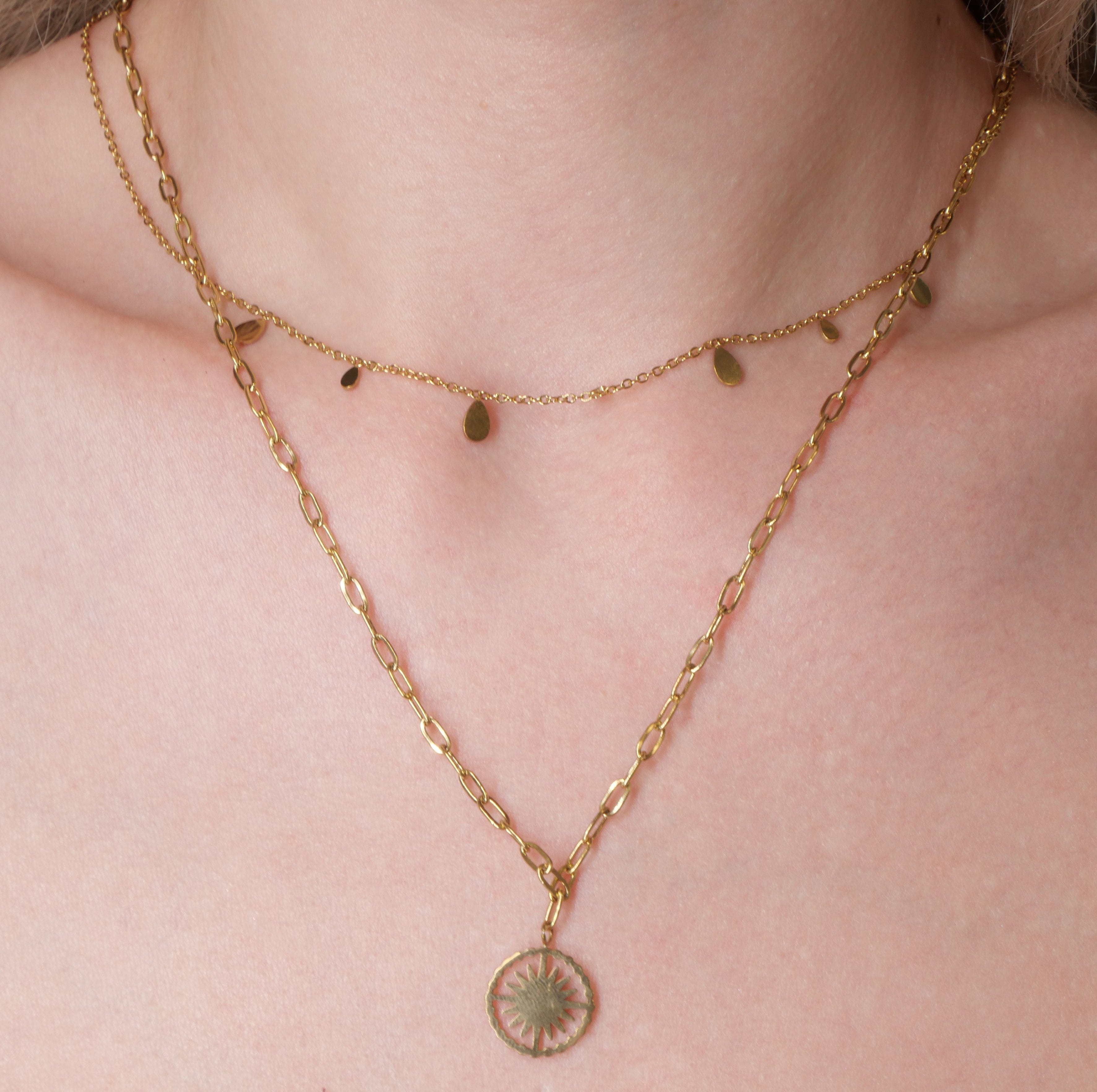 Ce sont les détails du colliers Summer qui vous feront tomber sous son charme. Un collier a double chaine avec un pendentif représentant un soleil, sa couleur dorée viendra illuminer vos looks.